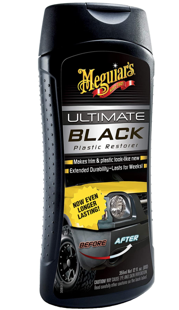 Meguiar’s Ultimate Black Plastic Restorer brings new life to all exterior plastic, vinyl, and rubber trim such as bumpers, moldings, door handles, rear-view mirror housings and windshield cowlings. Utilizing break-through UV clear coat technology, Meguiar’s Ultimate Black Plastic Restorer significantly outlasts conventional protectants and trim care products. This durable formula dries almost instantly, is non-greasy and will not streak when treated surfaces get wet. With Meguiar’s Ultimate Black quickly make trim and plastic look-like new, create a rich darkness and shine, and provide outstanding, durable UV protection.